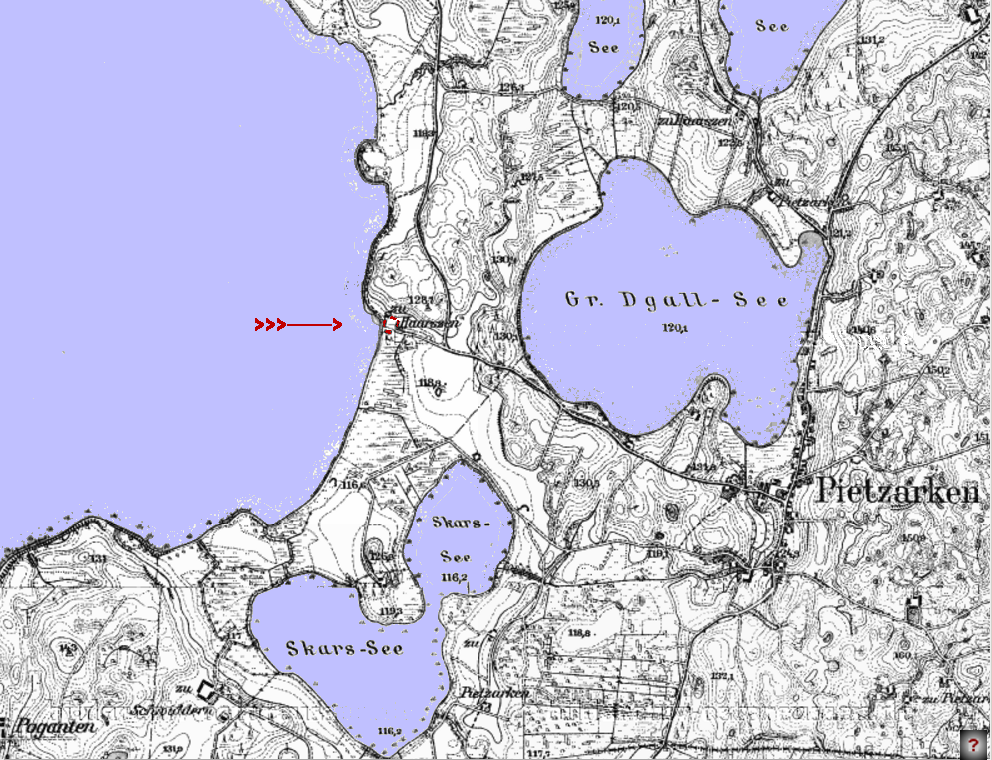 | Der Mauersee zwischen Angerburg und Lötzen ist durch anstauen des Wassers um mehre Meter aus mehren kleineren Seen entstanden. Die Teilbereiche des Mauersees tragen noch die Namen der alten Seen. Sie bilden zusammen den Mauersee. Dadurch entfiel der Bau von Kanälen und Schleusen für die Schifffahrt. | Haarszen - Neu-Haarszen | Neu-Haarszen | Karte mit Einwohnern von Neu Haarszen - Der Gunstnik lag südlich außerhalb des Ortes |