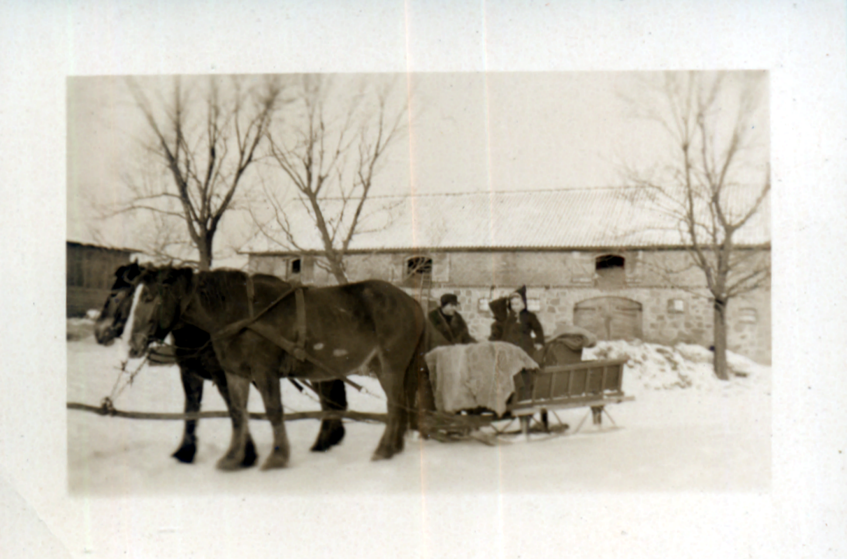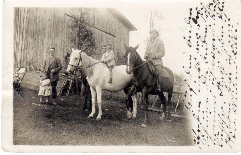 | Der Hof Bergmans (Der Gunstnik, ehm. Insthof der Gutshofs der Fam. Volkmanns) | ganz links : Lilli & Herbert Bergmann | links in der Kutsche + = Lilli Bergmann | Die Windturbiene mit 2 Kletterern 1940 | ||||||||||