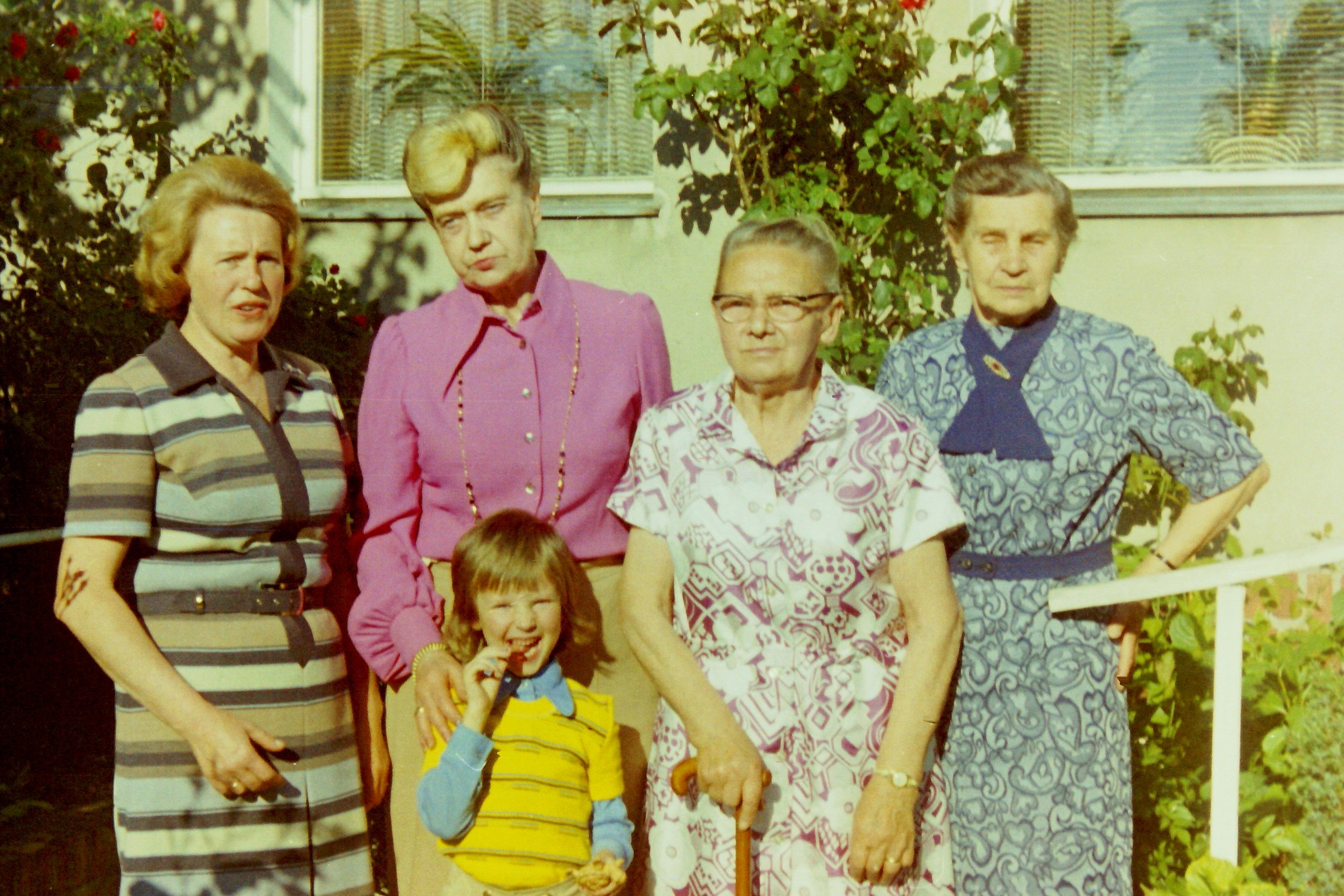 | 3 von 4 Schwestern - Hilde Peise, Martha Krone & Meta Bergmann, alle geb. Volkmann | Wie vor. außerdem die Tochter der 4. Schwester Ella Tarrach geb. Volkmann, Elfriede (Mausi) Rudolph geb. Tarrach mit Enkelin Anja | Meta Bergmann mit ihrem Urenkel Andreas Meier | Anna Toll (geb. Dulias), Ingeborg Bergmann, Marta Krone, Schwester von nebenstehender Meta Bergmann (beide geb. Volkmann) | ||||||||||