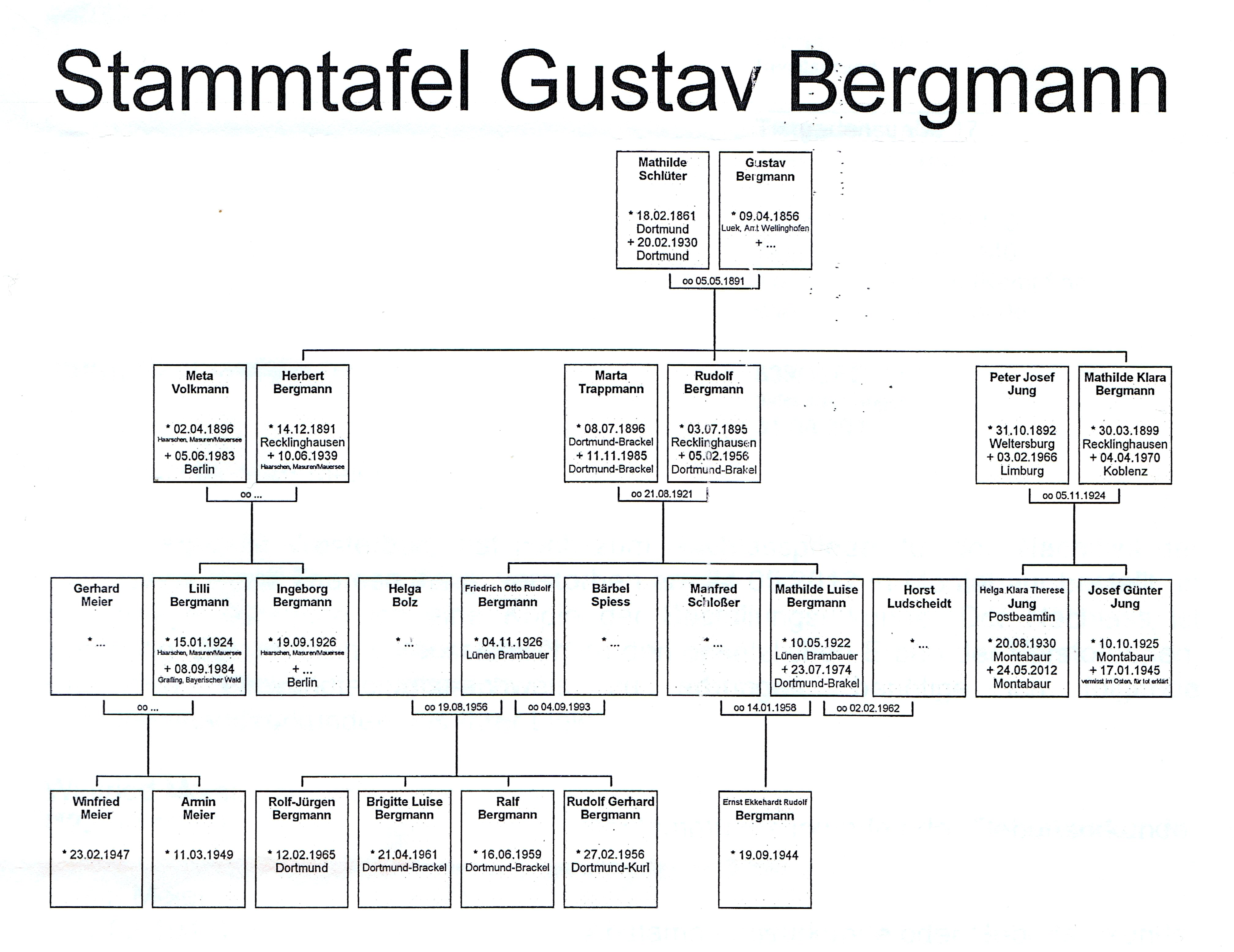 | Stammtafel der Familie Gustav Bergmann | Gustav Bergmann (Fahrradhändler) | Caroline Mathilde Bergmann verw. Reihmann geb. Schlüter | |||||||||||