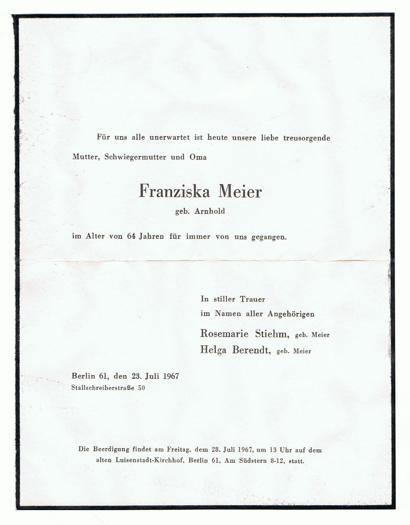 | Wilhelm (Willi) Meier ca.1915 - Bruder von Georg Meier | 1966 Wilhelm Meier - Todesanzeige | 1967 Franziska Meier geb. Arnold - Todesanzeige | |||||||||||
