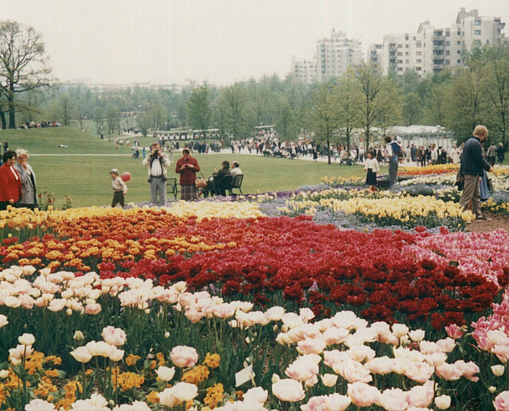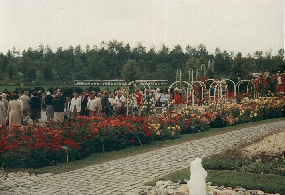 Auf den Fotos kaum zu erkennen, die Bahn auf der Münchner IGA 83 (auf Feldbahngleisen 600 mm). Man fotografierte lieber die Blumen. Auf dem letzten Bild sieht man gut die Spuren eines aus dem Gleis gesprungenen Wagens. Feldbahners Leid :-) |