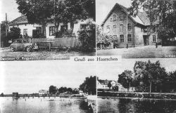| Gutshaus Volkmann (Neu-)Haarschen (+=Meta Volkmann & Herbert Bergmann) | Meta Volkmann & Herbert Bergmann | Opa Ludwig Volkmann, Hilde Volkmann, Ella Volkmann, Meta Volkmann & Herbert Bergmann um 1916 | Alte Ansichtskarte von Haarschen aus den 30-40er Jahren | ||||||||||