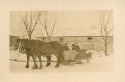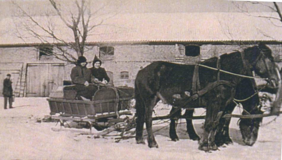 | Der Hof Bergmans (Der Gunstnik, ehm. Insthof der Gutshofs der Fam. Volkmanns) | ganz links : Lilli & Herbert Bergmann | links in der Kutsche + = Lilli Bergmann | Die Windturbiene mit 2 Kletterern 1940 | ||||||||||