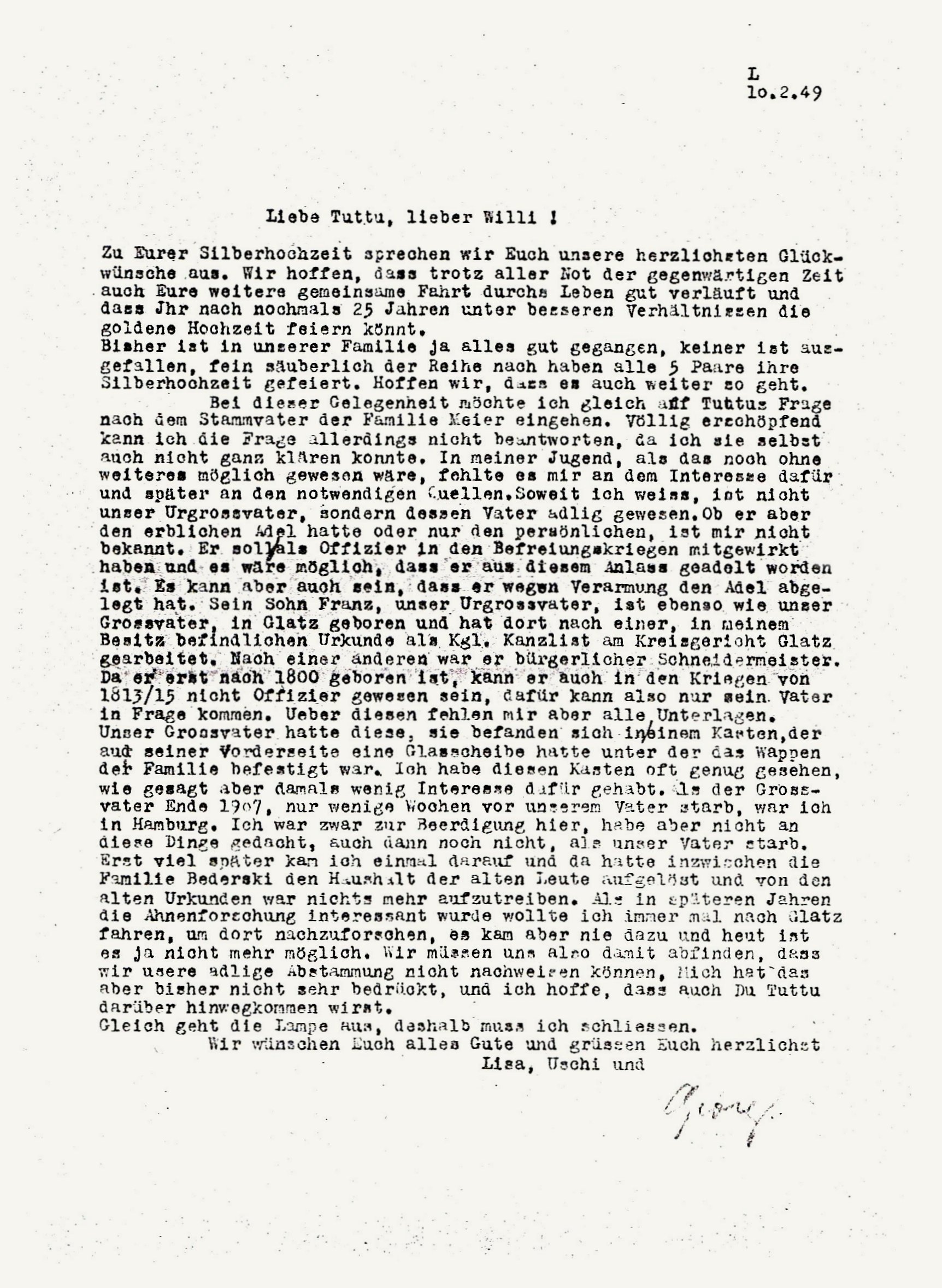 Georg Meier zum Thema adelige Familie mit Familienwappen an seine Schwester Tuttu zur Silbernen Hochzeit 1949 |