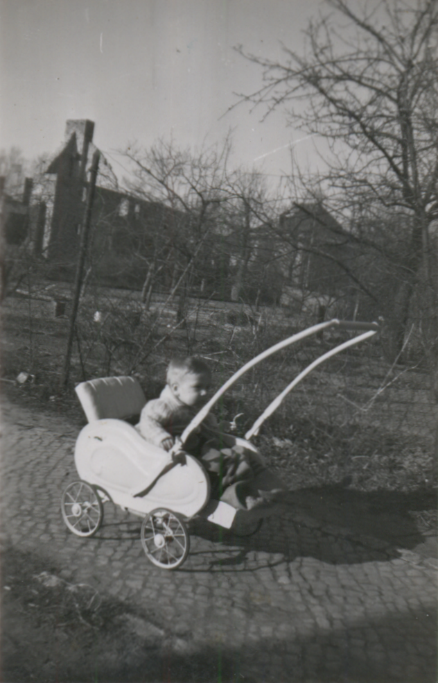 Armin Meier in der Lotze Strasse vor Ruinen im Hintergrund. Die Bomben hatten den Nordbahnhof der Goerzbahn knapp verfehlt. |