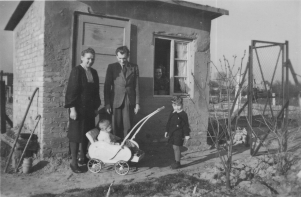 Meta Bergmann, Armin, Gerhard & Winfried Meier vor unseren ersten Laube an der Finkenstein Allee. Der Garten sicherte uns nach der Blockade teilweise die Ernährung. Es gab trotz Wiederaufbau keine Arbeit und es fehlte an Geld. |