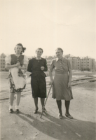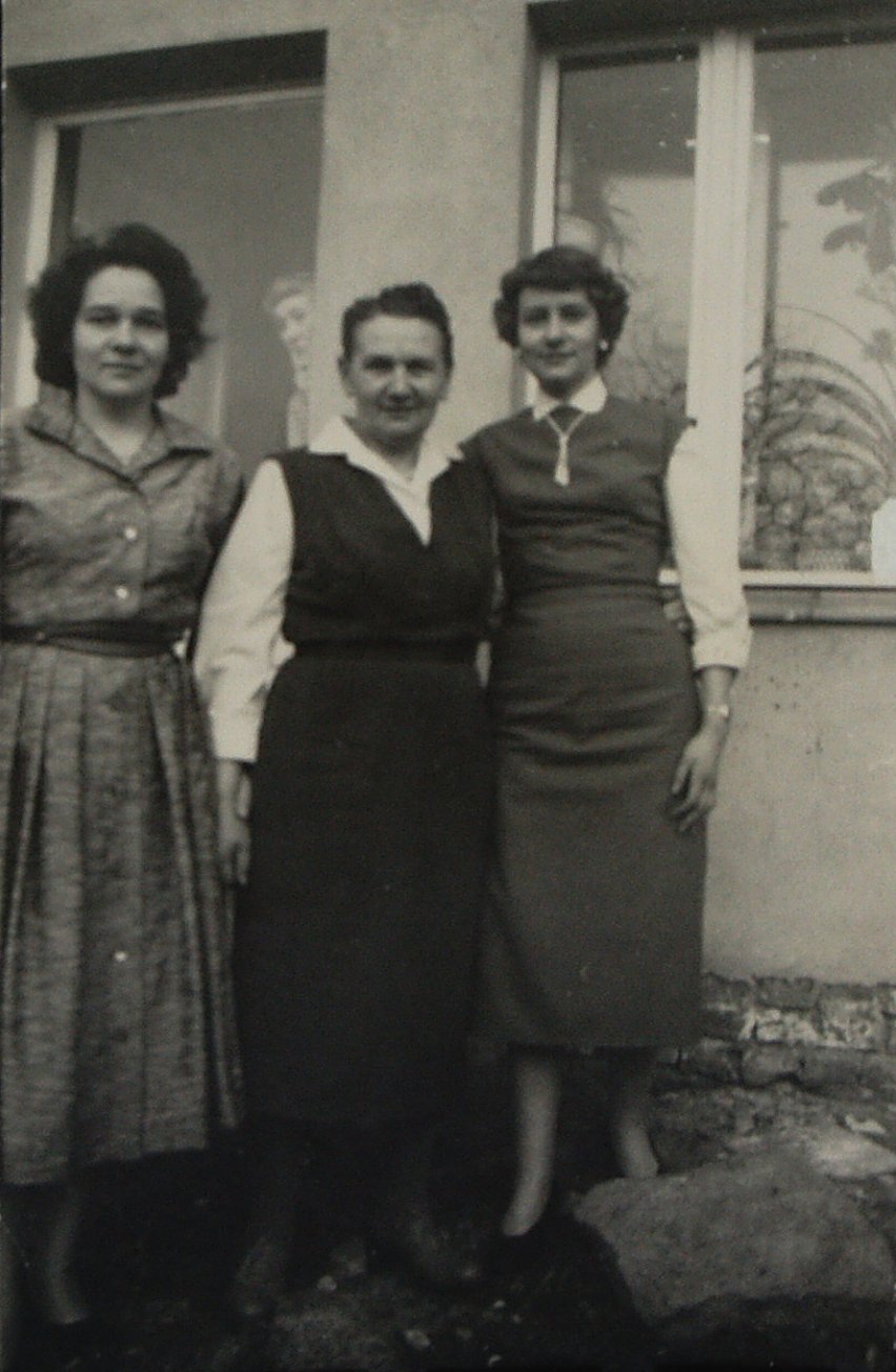 | Inge Bergmann um 1950-51 | Ingeborg Bergmann, Martha Krone (geb. Volkmann) Meta Bergmann (geb. Volkmann) an der Goerzbahn im Hintergrund Neubauten für Flüchtlinge. Wohnblocks für Vertriebene | Martha Krone & Meta Bergmann (Schwestern) im Schrebergarten | Unsere erste Schrebergärten befanden sich neben dem Industriebau West, der zweite am Dahlemer Weg- Oma Bergmann wohnte anfangs bei Meiers in der Lotze Str.,dann in einem Zimmer im Eckhaus Gräfenberger Weg / Ecke Cutiusstr. später in der Vertriebenen-Siedlung an der Brettnacher Str. im Brittendorfer Weg. | ||||||||||