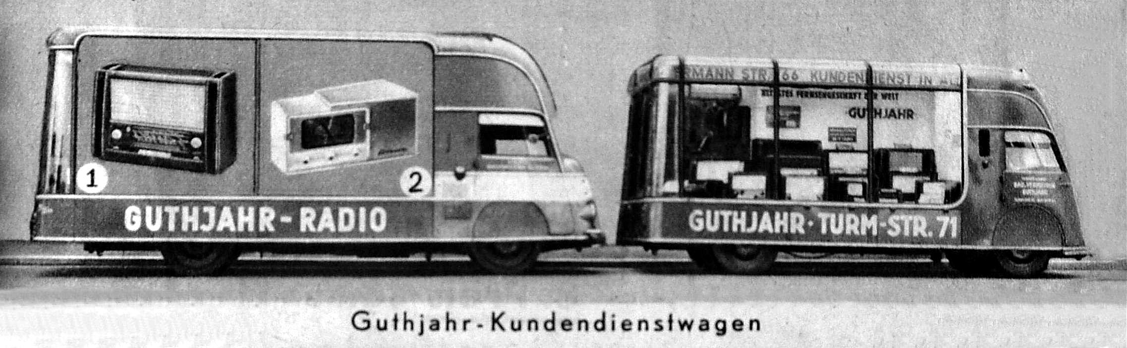 1952-53 Die Bau-Pläne der umlaufenden Laufschrift des einen Wagen sind noch vorhanden. Die Konstruktion erfolgte durch Gerhard Meier, damals Werkstadtleiter der Firma Guthjahr-Radio, dem ersten Fernsehgeschäft der Welt, einem Fernseher-Pionier seit 1935. Die Wagen hatten eine ausfahrbare und drehbare Fernsehantenne. Die Firma Gaubschat in Berlin- Neuköln baute die Wagen. |