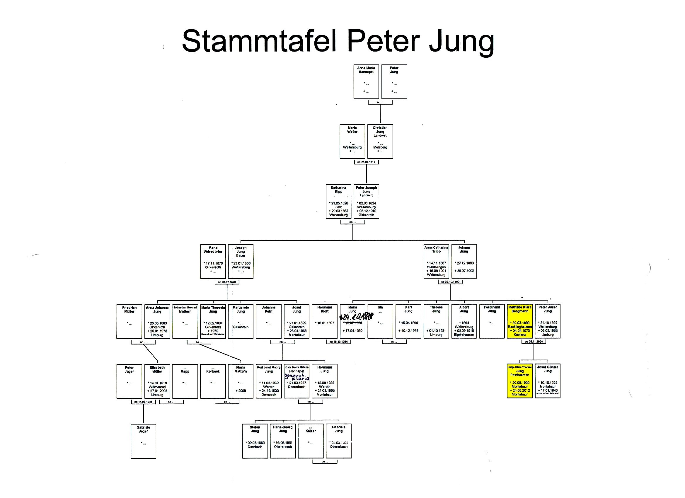 | Stammtafel Peter Jung | Klara Jung geb. Bergmann, Josef Jung und Emmi (Ida) Reimann Frau von Karl Reimann aus Dortmund, Okt. 1949 | v. l. Winfried & Lilli Meier - Klara Jung - Gerhard Meier - Josef Jung - N.N.? - Helga Jung | 1970 Todesanzeige Klara Jung geb. Bergmann | ||||||||||