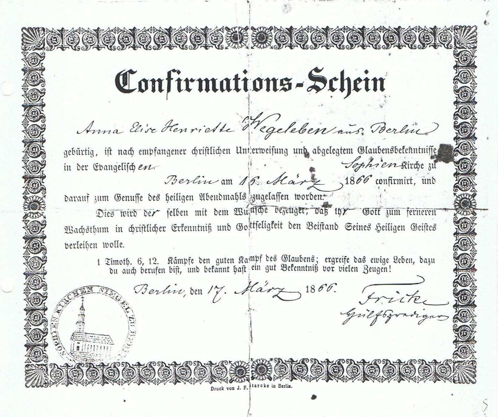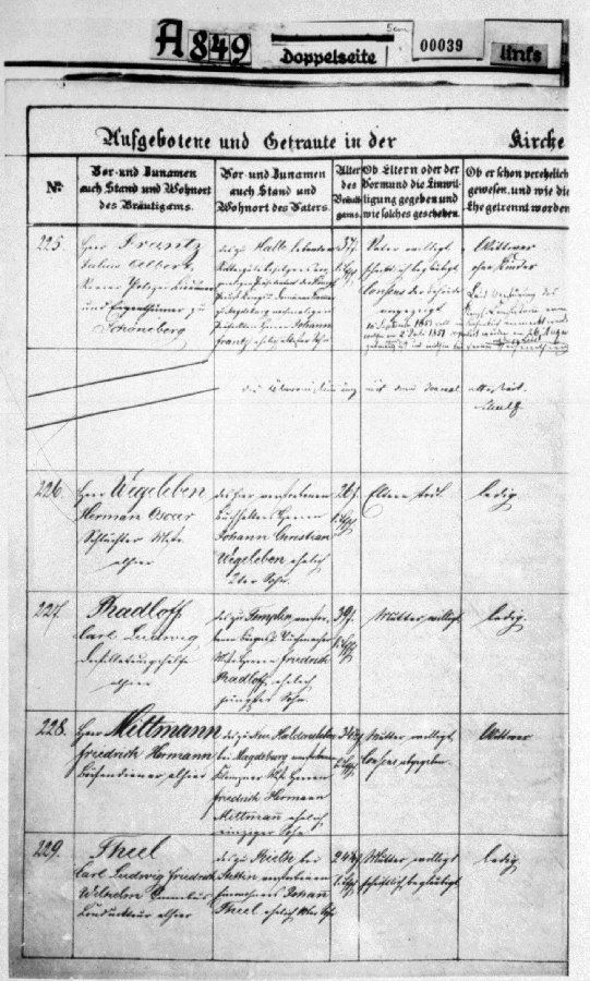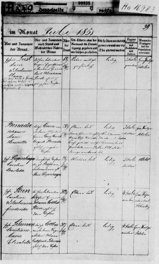 | 1851 Anna Elise Hennriette Wegeleben geb.Benada - Taufschein (Mutter von Elise Meier) | Aufgebot Juli 1853 - Herrmann Oskar Wegeleben - Johanna Marie Henriette Benada | 1866 Anna Elise Henriette Wegeleben | |||||||||||