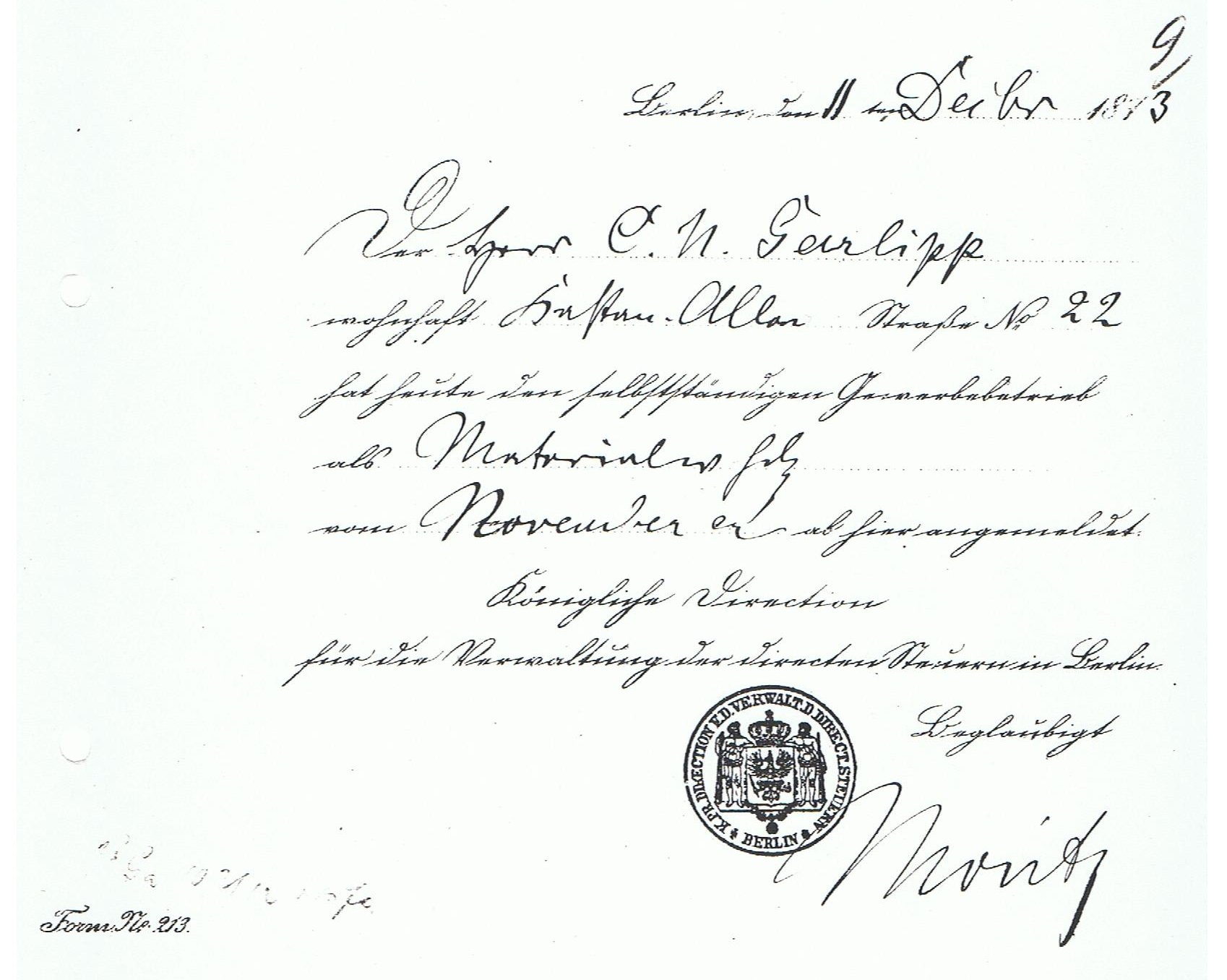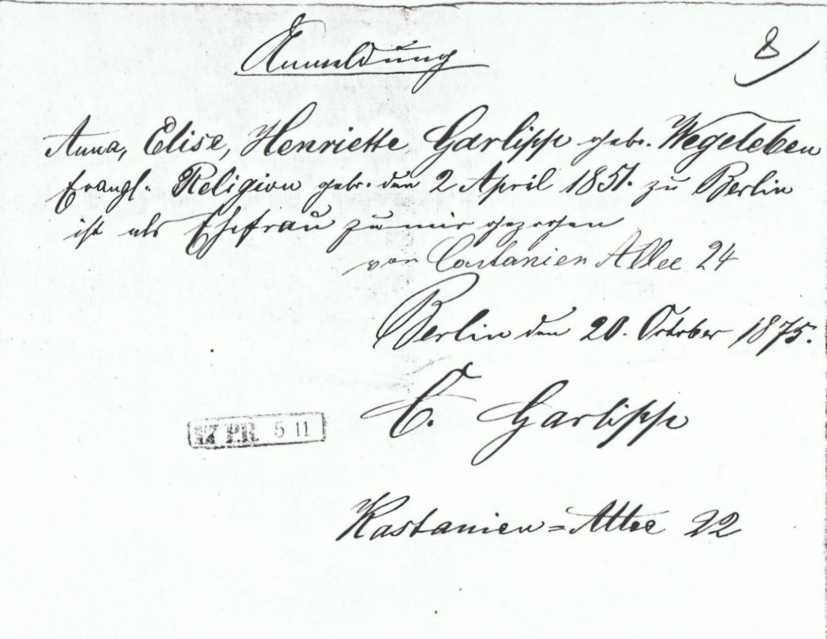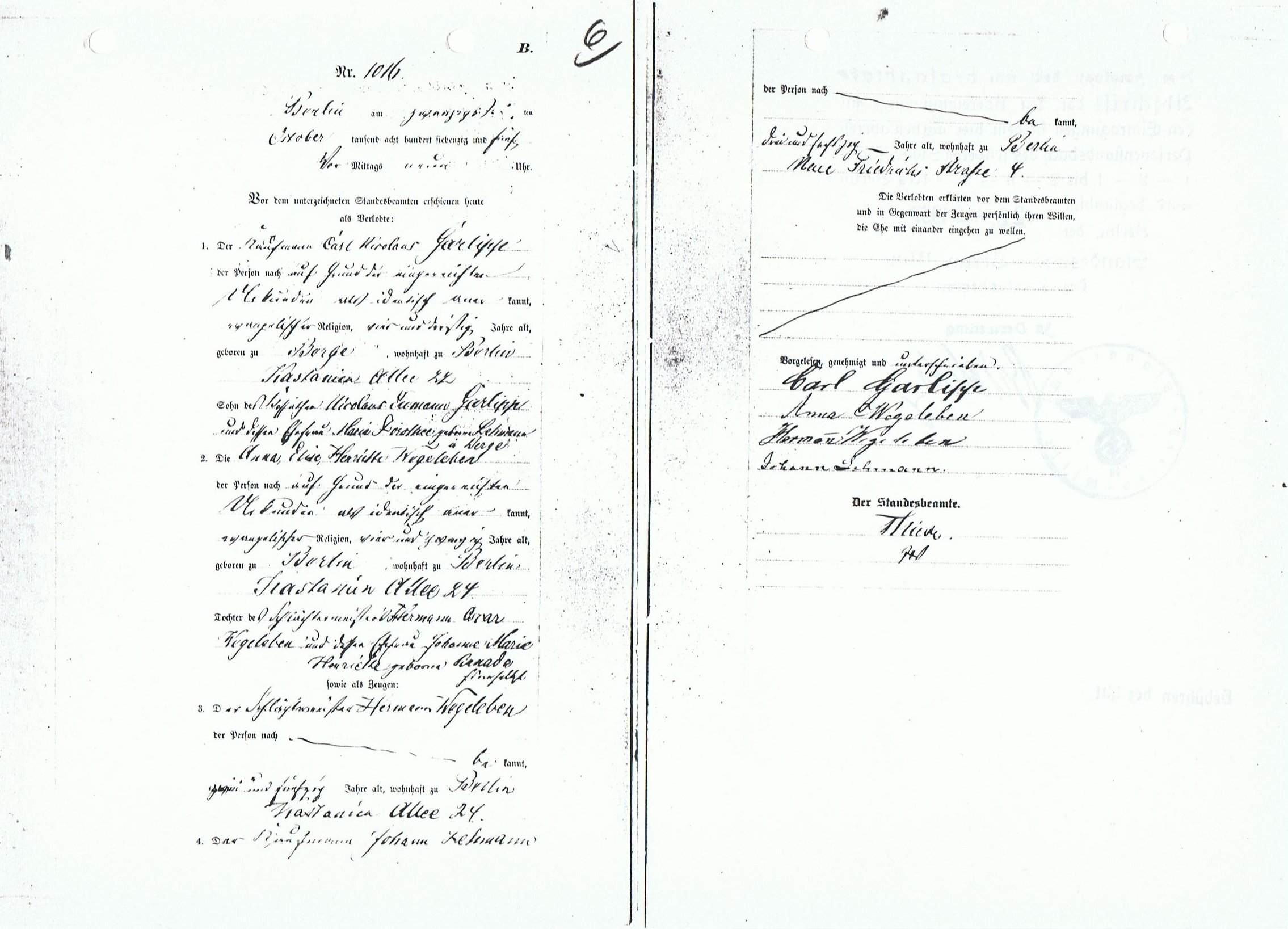 | 1873 Carl Nikolaus Garlipp - Anna Wegelaben - Heiratsurkunde | 1873 Carl Nikolaus Garlipp - Gewerbeanmeldung | 1875 Anna, Elise, Henriette Garlipp - Anmeldung des Zuzuges zum Ehemann | |||||||||||