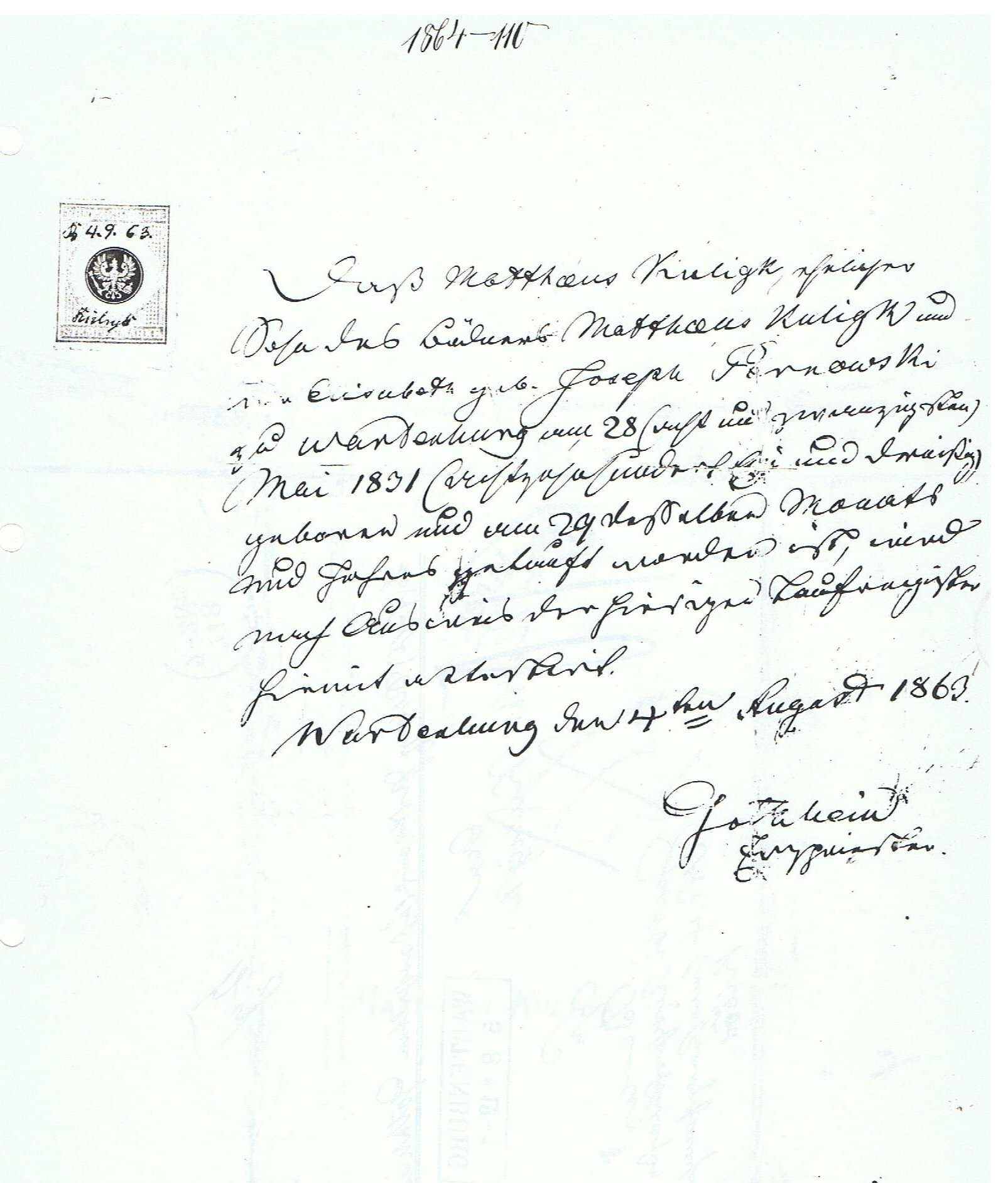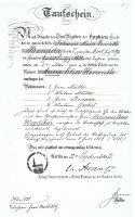 | 1860 Geburts- und Taufschein Mathäus Kuligk aus Wartenburg / Ostpreußen geb am 28. Mai 1831 | 1860 Geburts- und Taufschein Mathäus Kuligk Rückseite | 1826 Anna Elisabeth Weigelt - Taufbescheinigung aus Schlichtingheim über Glogau / Schlesien (1939) | vor 1887 Elisabeth & Matthäus Kuligk (Eltern v. Maria Meier) | ||||||||||