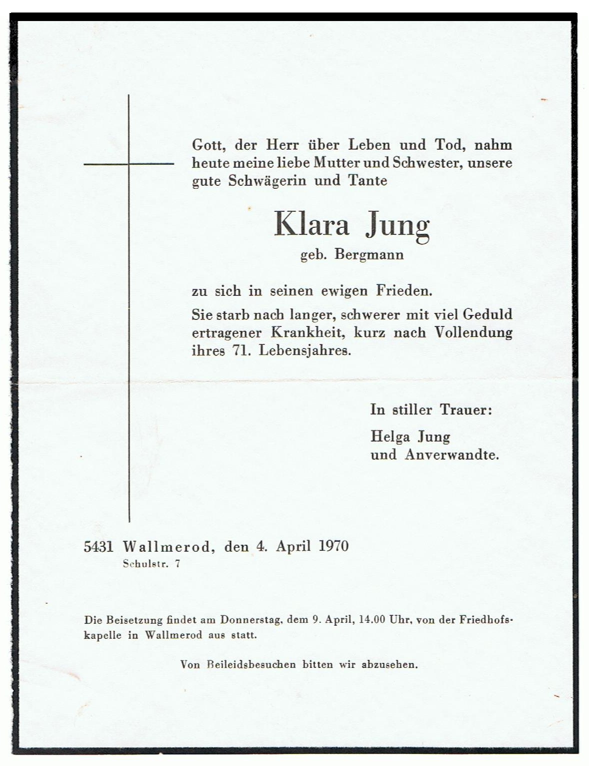 | Wohnhaus Jung in Walmerod, Schulstrasse | Wohnhaus Jung in Walmerod | Helga Jung ( u..a. Cousine von Rudolf Bergmann und Lilli Meier geb. Bergmann) | |||||||||||