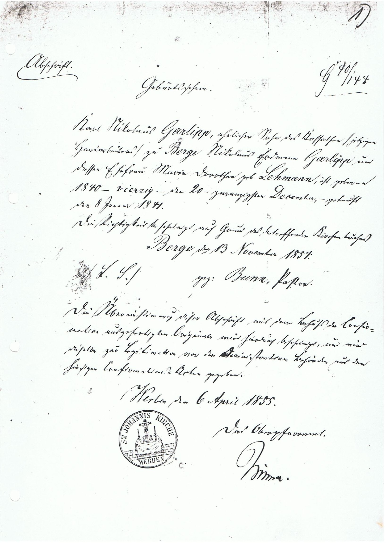 | 1841 Carl Nokolaus Garlipp Geburtsschein und Taufschein (Vater von Elise Meier) | 1855 Carl Nikolaus Garlipp - Konfirmationsschein | Karl Nikolaus Garlipp - Geburts und Taufschein | |||||||||||