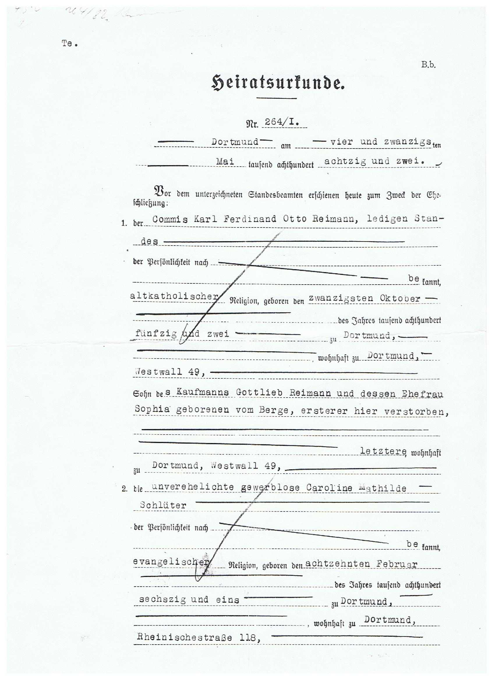 | Schlüter Geburtshaus - Kupferschmiede - Dortmund | 1882 Heiratsurkunde Carl Ferdinand Otto Reimann und Caroline Mathilde Schlüter v | 1882 Heiratsurkunde Carl Ferdinand Otto Reimann und Caroline Mathilde Schlüter h | Caroline Mathilde Bergmann verw. Reimann geb. Schlüter | ||||||||||