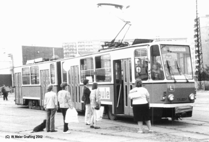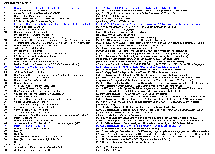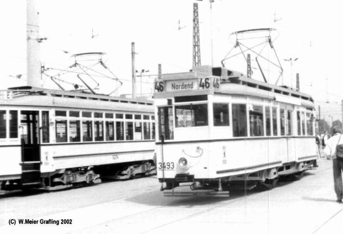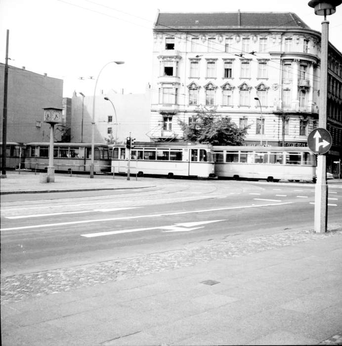 Siemens hatte in der Gewerbeausstellung am Lehrter Bahnhof am 31.05.1879 die erste funktionierende elektrische Lokomotive der Welt vorgeführt. Im Berliner Vorort Groß-Lichterfelde (seinerzeit die einwohnermäßig größte Gemeinde Deutschlands) fuhr ab dem 16.5.1881 die erste elektrische Straßenbahn der Welt. Nun ging es sehr schnell. Am 26.09.1900 verfügt die Aufsichtsbehörde die generelle Einführung des Oberleitungsbetriebes. Am 21.08.1902 fuhr die letzte Pferdebahn in Berlin und 8 Jahre später auch die letzte im Umland. 1900 unternimmt 2 Jahre lang einen elektrischen Versuchsbetrieb mit 750 V Gleichstrom auf der Wannseebahn. Nach ihrem Baubeginn am 10.09.1896 ist am 14.12.1902 ist die Hoch- und Untergrundbahn auf 10,7 km in Betrieb. Am 15.06.1903 beginnt der elektrische Zugbetrieb vom Potsdamer Ringbahnhof nach Lichterfelde-Ost mit 550 V Gleichstrom. Dieser bleibt bis zum 2.7.1929 in Betrieb, dann erfolgt die Umrüstung auf 800 V und der Übergang zur S-Bahn. 1911 betreibt die größte Gesellschaft die GBS 113 Straßenbahnlinien und es werden über 450 Mill. Menschen befördert. Am 01.04.1912 tritt das Zweckverbands-Gesetz Groß-Berlin in Kraft. Der Verband bemüht sich um eine einheitliche Verkehrspolitik. Im Juli 1914 hat die ABOAG 4434 Pferde 520 Pferdebusse 336 Kraftomnibusse, noch werden mehr Fahrgäste mit den Pferdebussen befördert rund 48 Mill. und nur 37 Mill. mit den Autobussen. Aber immer mehr Motor-Omnibusse sind in Betrieb und die Zahl der Pferdebusse nimmt stetig ab. Im Tagbetrieb waren sie noch bis 1920 unterwegs, im Nachtbetrieb sind sie sogar bis zum 23.08.1923 im Einsatz. Am öffentlichen Personenverkehr ist der Anteil der mit Bussen beförderten Fahrgäste mit um die 4% (1920) sehr gering. Am 1.10.1920 entsteht aus 8 Stadtgemeinden 59 Landgemeinden und 27 Gutsbezirken die neue Stadt Groß-Berlin. Sie ist in diesem Augenblick mit 880 qkm die flächenmäßig größte Stadt der Welt. Mit 4,2 Mill. Einwohner ist sie die drittgrößte Stadt der Erde. 1923 werden rund 1600 Straßenbahnwagen in Auftrag gegeben und in Dienst gestellt. 1925 geht die S-Bahn in Betrieb. 1927 werden 638 Viertelzüge bestellt. Am 30.11.1928 wird die BVG gegründet und nimmt am 1.1.1229 ihren Betrieb auf. Zur ihr gehören die Straßenbahn, die Omnibusse und die U-Bahn. Die S-Bahn gehört zur Reichsbahn. In Berlin gab es auch als gleislose Straßenbahn O-Bus Linien. Es wurde In Johannisthal und Steglitz mit verschiedenen Systemen experimentiert. In Spandau und Steglitz waren dann drei O-Buslinien auch noch nach dem Krieg im Einsatz. In Ost-Berlin wurde am 01.08.1951 die erste Linie neu eingerichtet. Insgesamt entstanden 4 Linien auf denen auch ein Doppelstock- Sattelschlepper O-Bus fuhr Geblieben ist nach dem 2. Krieg nicht viel davon. Die BVG-West investierte nicht in die Straßenbahn, sondern ersetzte recht zügig die Bahnen durch Busse und stellte am 02.10.1967 die letzten Stb.-Linien ein. Die U-Bahn wird in Konkurrenz zur nun ostzonalen S-Bahn ausgebaut. Die BVG-Ost (später BVB) betrieb die Straßenbahn notgedrungen weiter, ihr fehlt das Geld und erst recht spät - ab dem Ende der 70er Jahre - wurde wieder in die Straßenbahn investiert. 1976 wird der erste Tatra-Straßenbahnwagen erprobt und 1978 gibt es den ersten regulären Linienbetrieb mit diesen Fahrzeugen. 1979 gibt es in Ostberlin die erste Straßenbahnneubautrasse nach Marzahn, die Linie 18 mit einer Länge von 17,7 km. 1980 kommen zwei weitere Linien hinzu, die Linie 11 mit 17,0 km und die Linie 12 mit 11,6 km. 1982 und 1983 wird sogar der kommerzielle Gütertransport per Straßenbahn aufgenommen. 1986 gibt es in Ost-Berlin 33 Straßenbahnlinien mit 433 km Linienlänge. Das Ostberliner Straßenbahnnetz ist nach der Wiedervereinigung der Grundstock des heutigen Netzes. Erst seit kurzem fährt auch wieder eine Linie bis ins ehemalige Westberlin. Es ist die Unfallträchtigste Linie der Straßenbahn, denn die Westberliner haben sich noch nicht wieder an die Straßenbahn gewöhnt. Inzwischen wurden die Tatrawagen modernisiert und es sind außerdem modernere Neubauzüge angeschafft worden. Der Hackesche Markt ist trotz viele Änderungen die Zentrale Haltestelle der Straßenbahnen in Berlin-Mitte geblieben. Die Fotos stammen aus dem Jahr 1990, also als noch niemand wusste wie es weitergehen wird. |