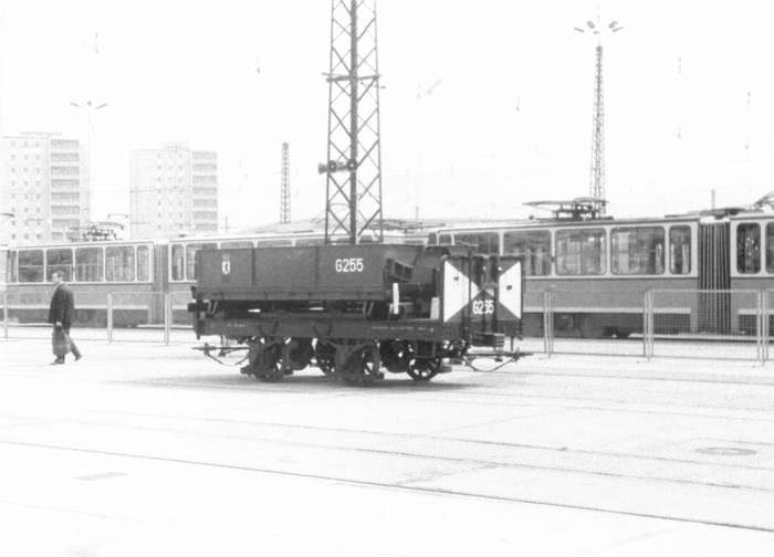 Die Arbeitswagen hatten früher in Berlin einen dunkelgrünen Anstrich mit Warnmarkierung >>> |