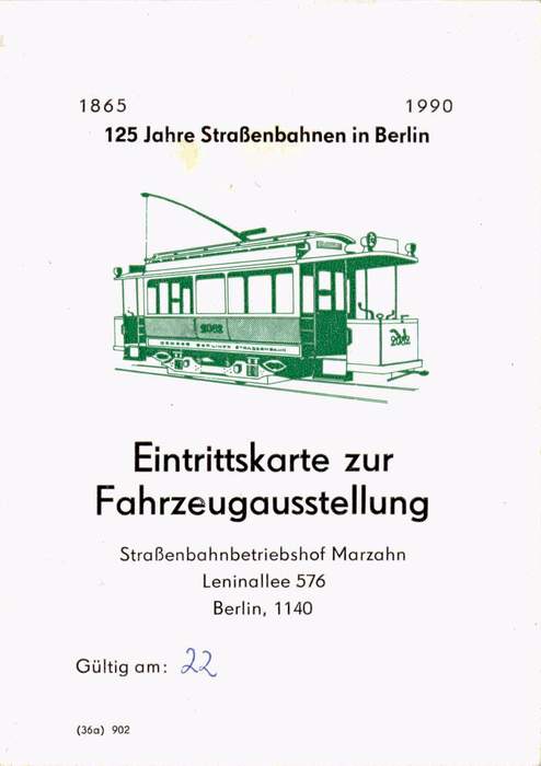Eintrittskarte zur Fahrzeugausstellung 125Jahre Straßenbahnen in Berlin |