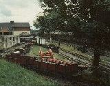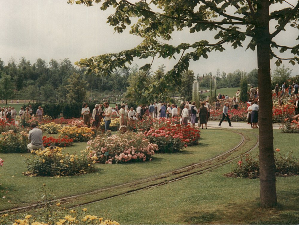 Auf den Fotos kaum zu erkennen, die Bahn auf der Münchner IGA 83 (auf Feldbahngleisen 600 mm). Man fotografierte lieber die Blumen. Auf dem letzten Bild sieht man gut die Spuren eines aus dem Gleis gesprungenen Wagens. Feldbahners Leid :-) |